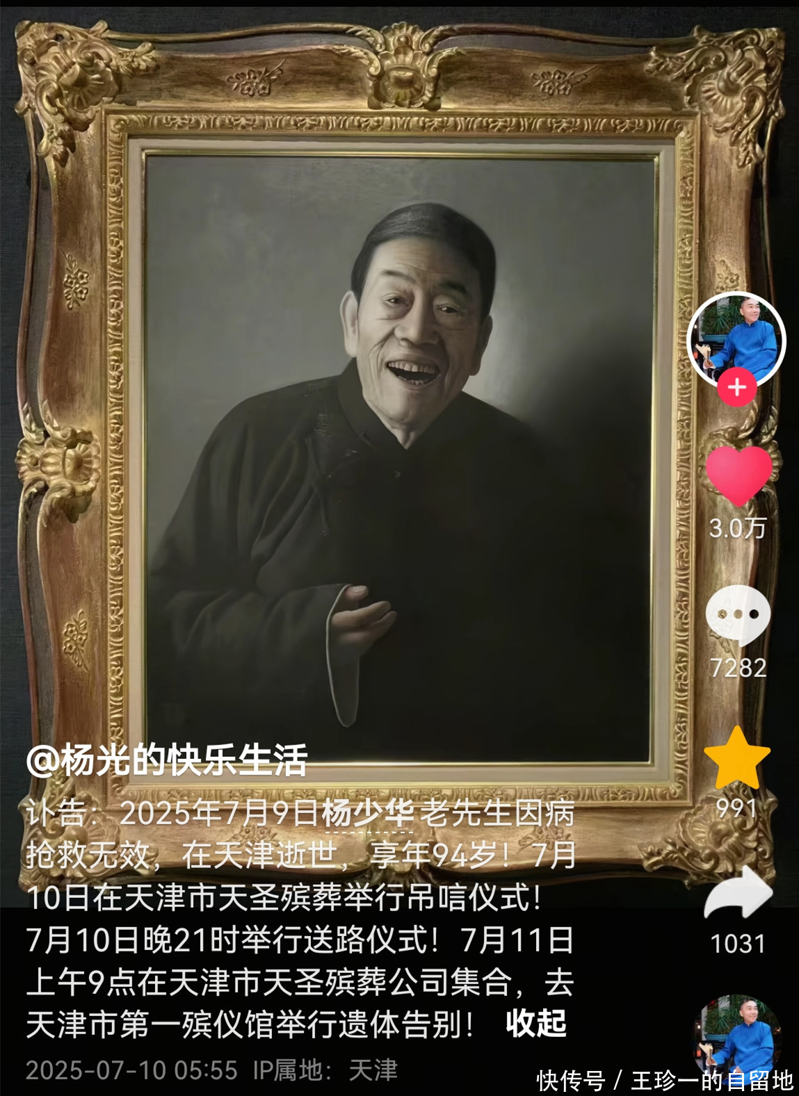 7月9日下午,媒体报道称杨少华离世,享年94岁。