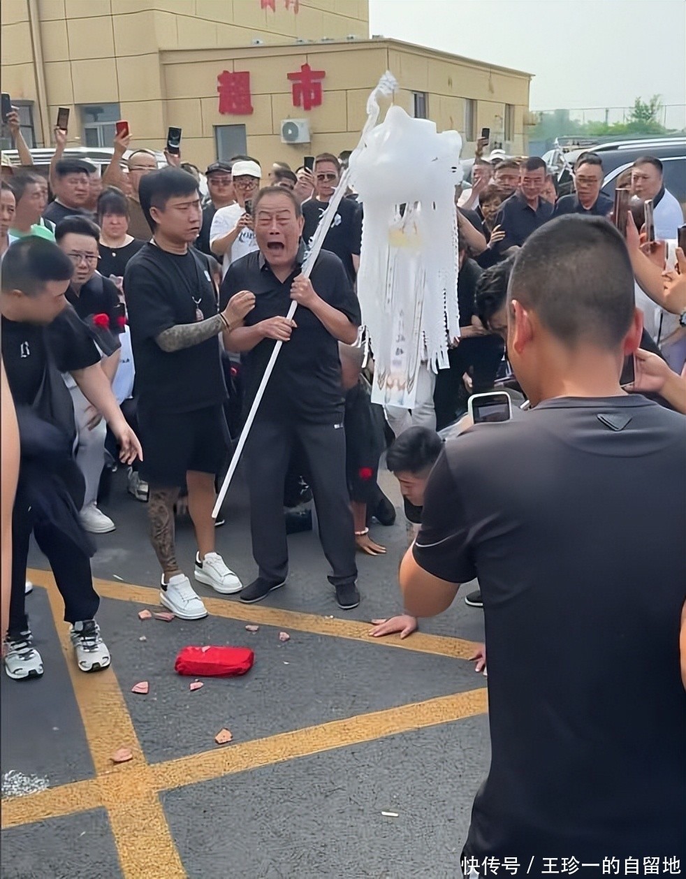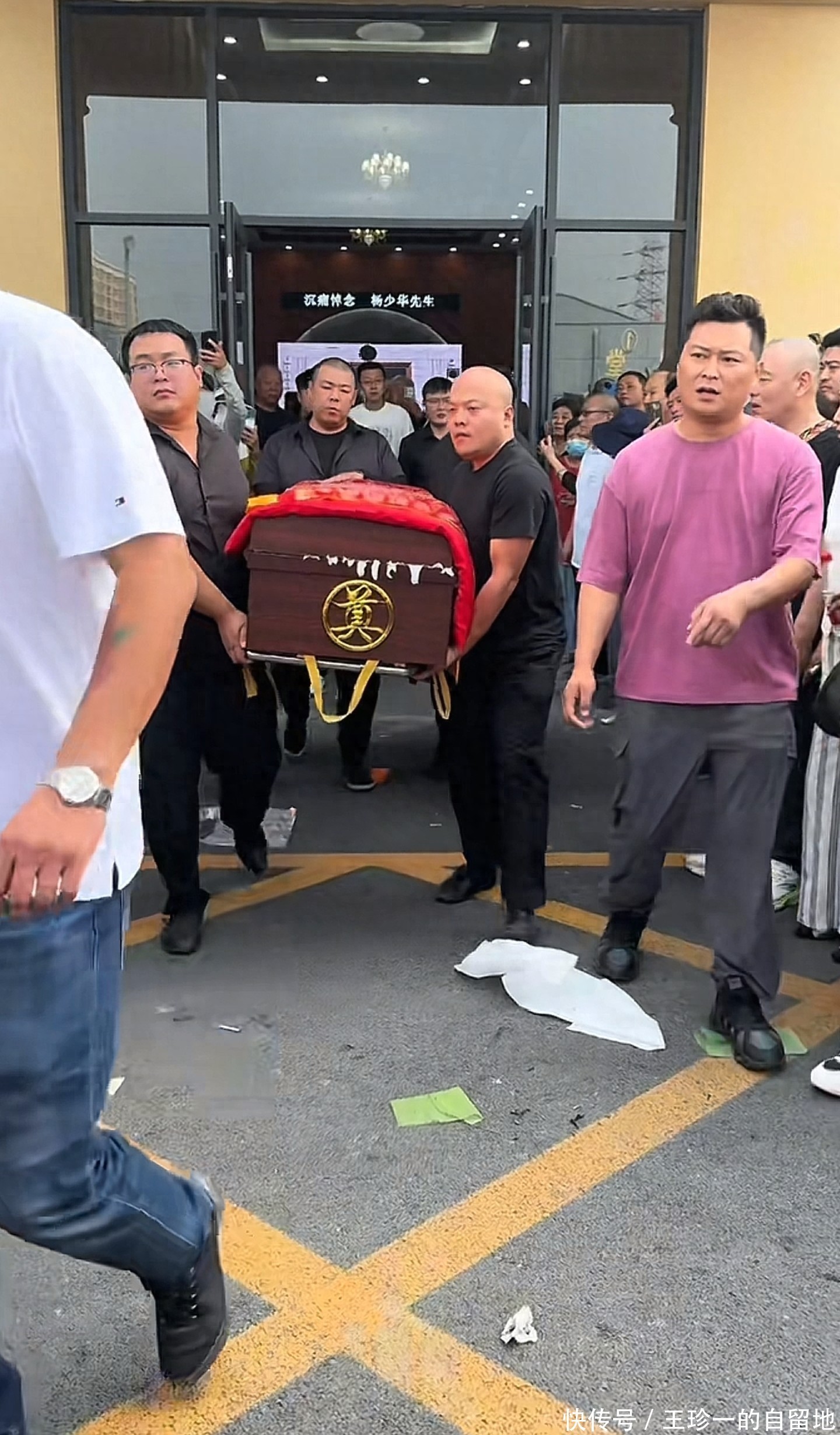 从视频中可以看到,杨少华的棺椁被抬出殡仪馆后,他的大儿子杨威摔盆打幡。