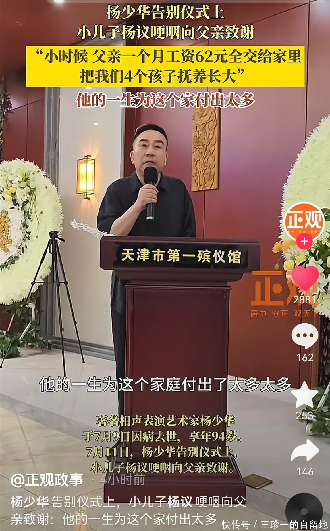 在第一天的吊唁仪式上可以看到杨少华的大儿子杨威和三儿子杨伦在灵堂答礼,杨伦神色悲痛,杨威眼睛哭肿了。