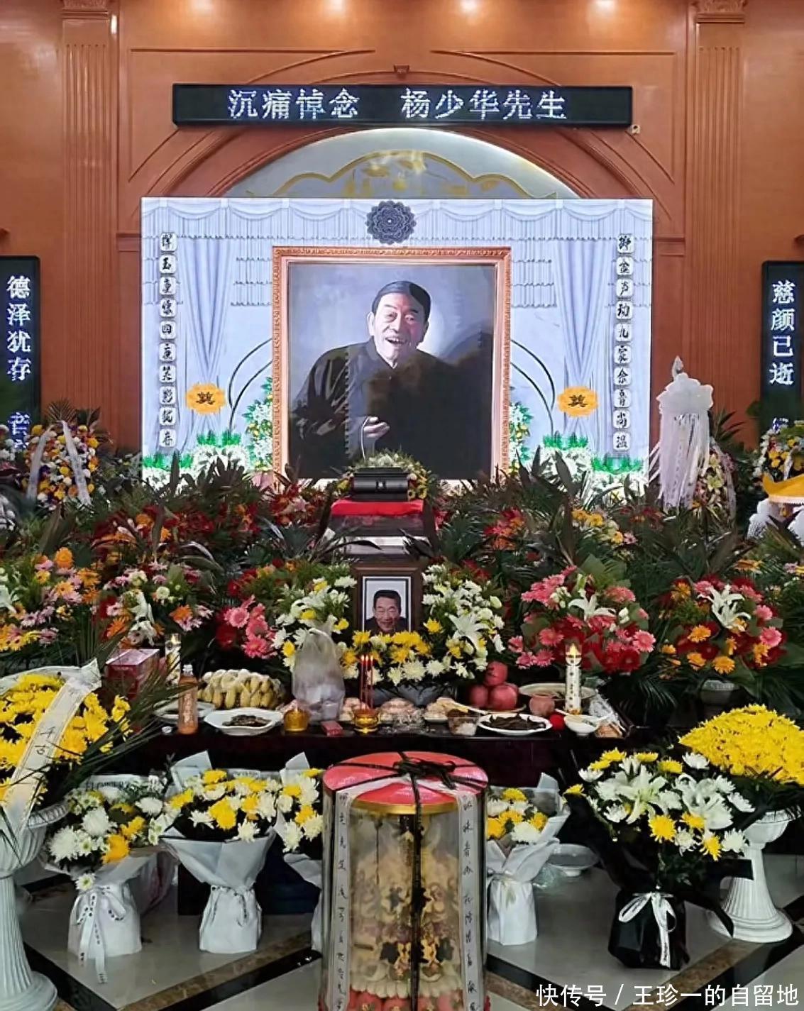 杨少华面带微笑的遗像摆在灵堂的正中央,在遗像两旁的电子屏幕上写着挽联:慈颜已逝、风木与悲,德泽犹存、音容宛在。