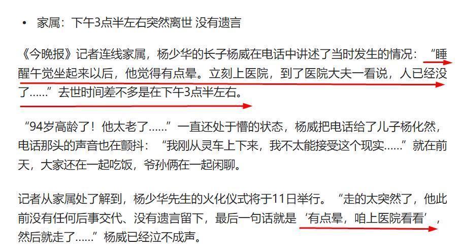 杨少华的大儿子杨威透露了父亲去世的临终细节,他说父亲午睡醒来后,感觉有些头晕,便让家人将他送往医院。
