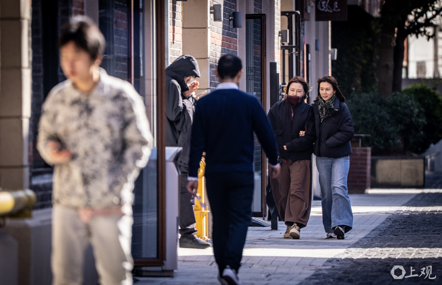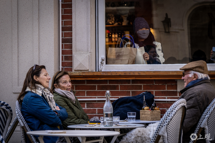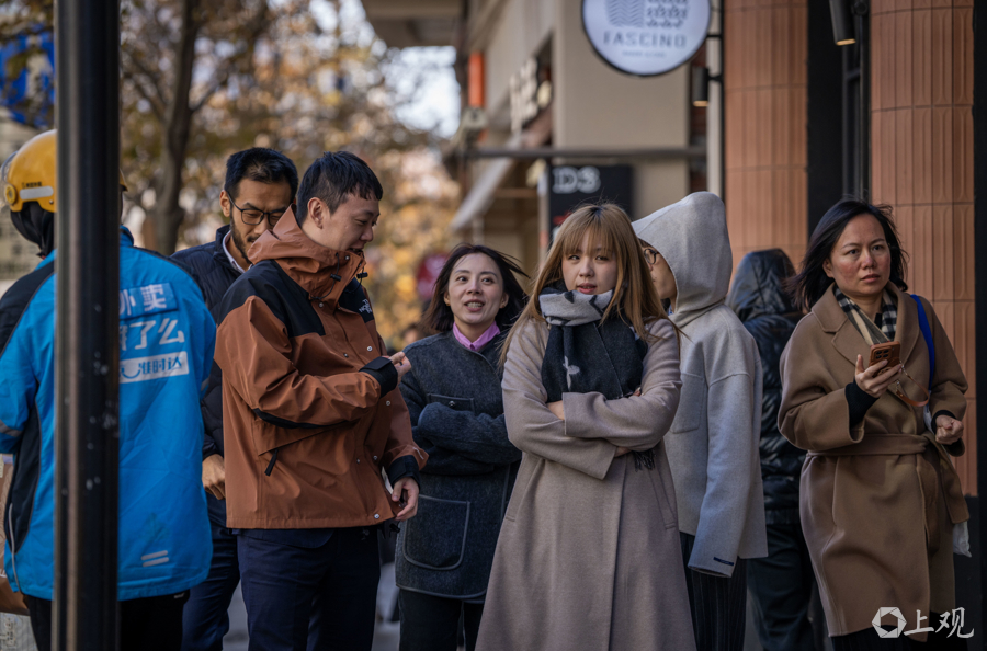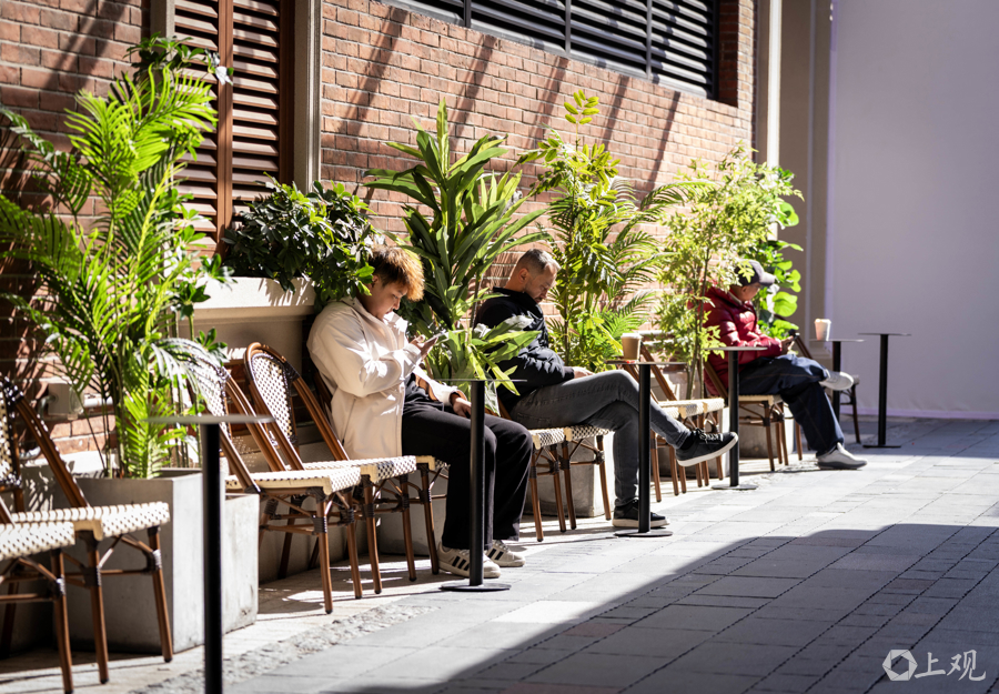 在丰盛里商区室外用餐的顾客裹起棉衣御寒。