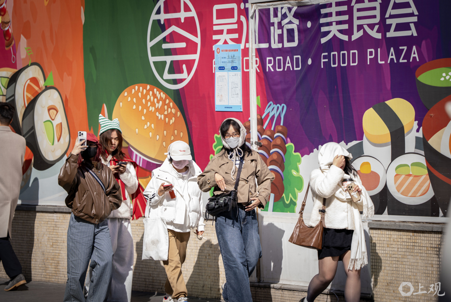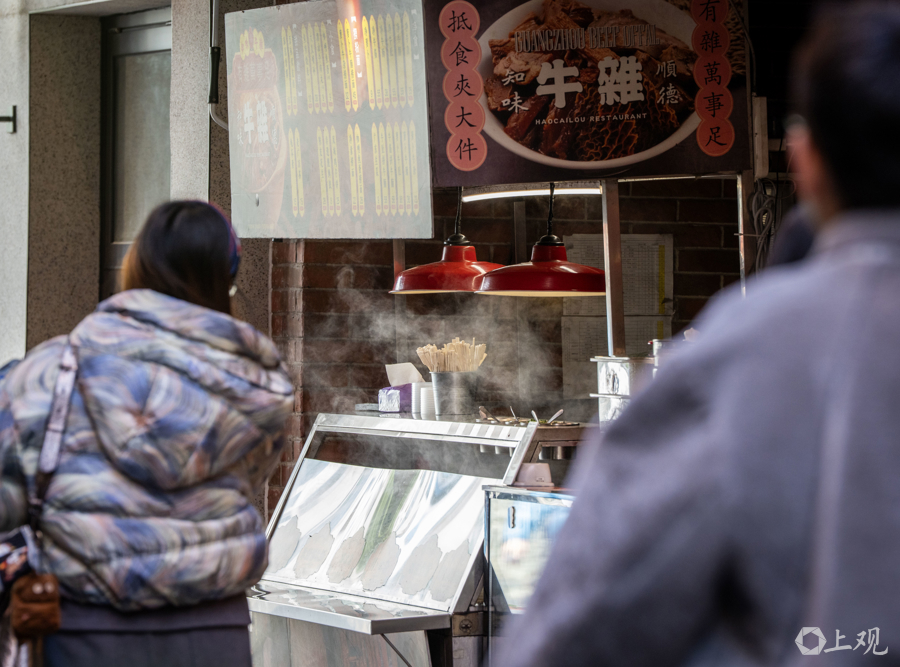 随着温度接近零度,地铁12号线南京西路地铁站出入口处美食摊上冒出的热气已清晰可见。