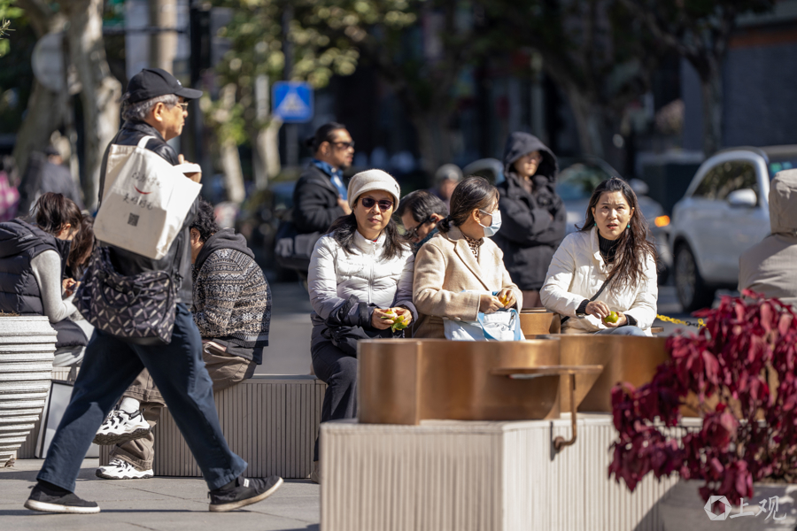 市民在地铁12号线南京西路站出入口附近晒太阳。